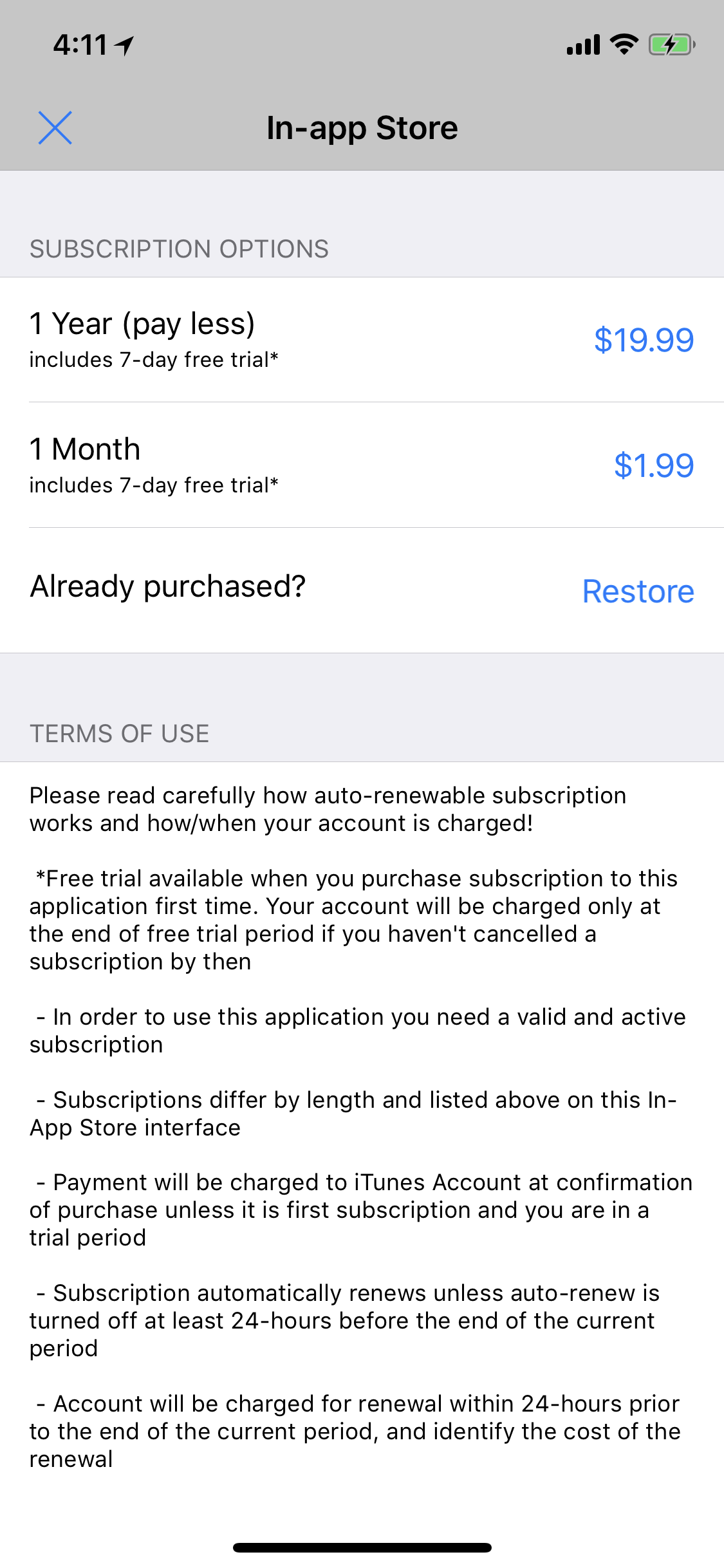 Чтобы использовать приложение вам нужно будет подписаться через In-App store. Подписки автоматически возобновляемых и может управляться через iTunes. Для первого подписки вы получите бесплатно 7 дней, и если вы haven ’ t отменили его до 7 Пойдены дни, будет взиматься абонентская плата. Вы можете отменить подписку в любой момент – есть ссылка на интерфейс в App Store поехать в iTune сделать это.
