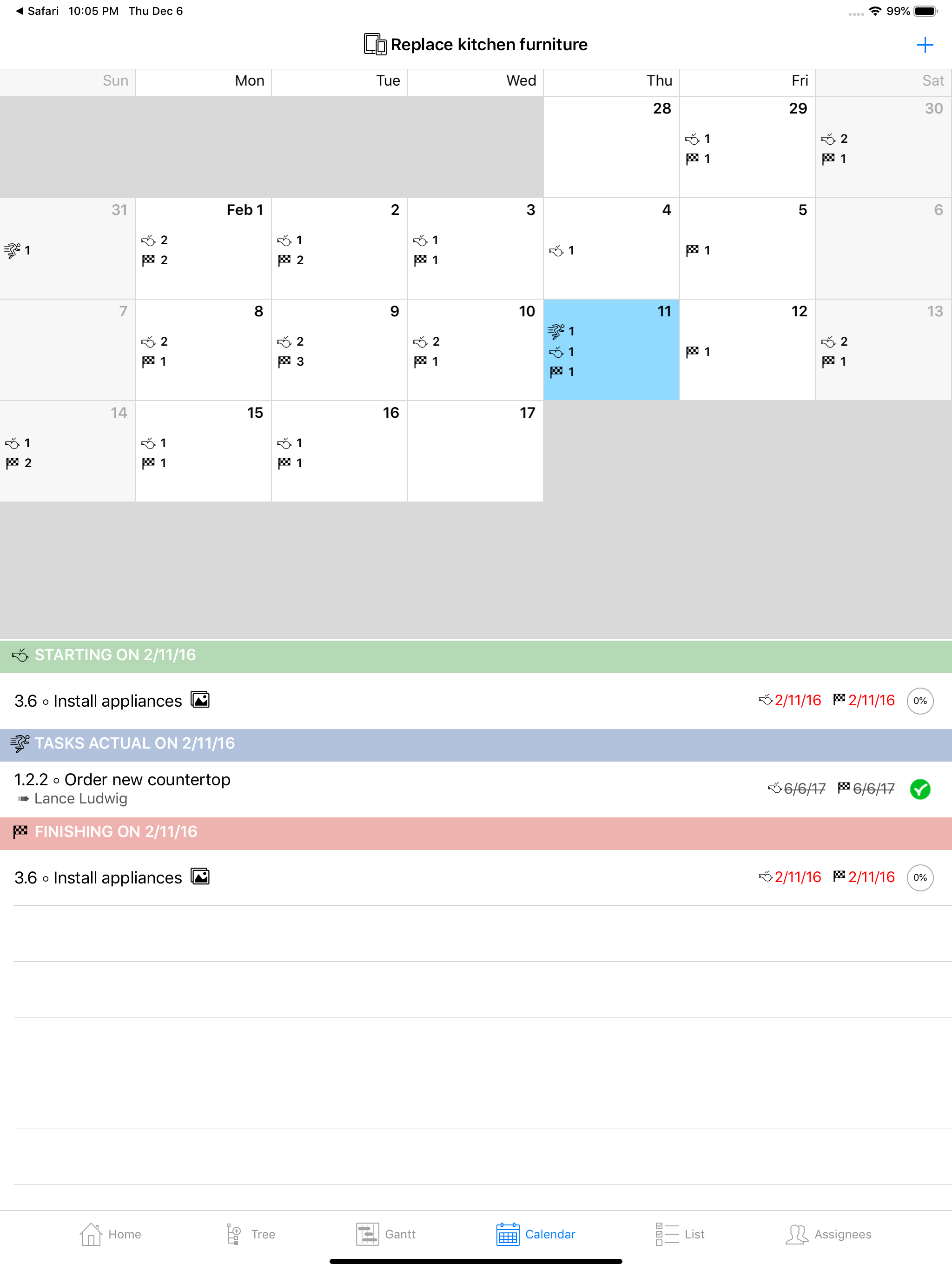 En la visualització del calendari usuari pot veure la llista de tasques que rellevants per data seleccionada (per exemple. tasques que o bé començar, acabar en la data o “real” – per exemple. començat abans i acabats després de la data seleccionada).